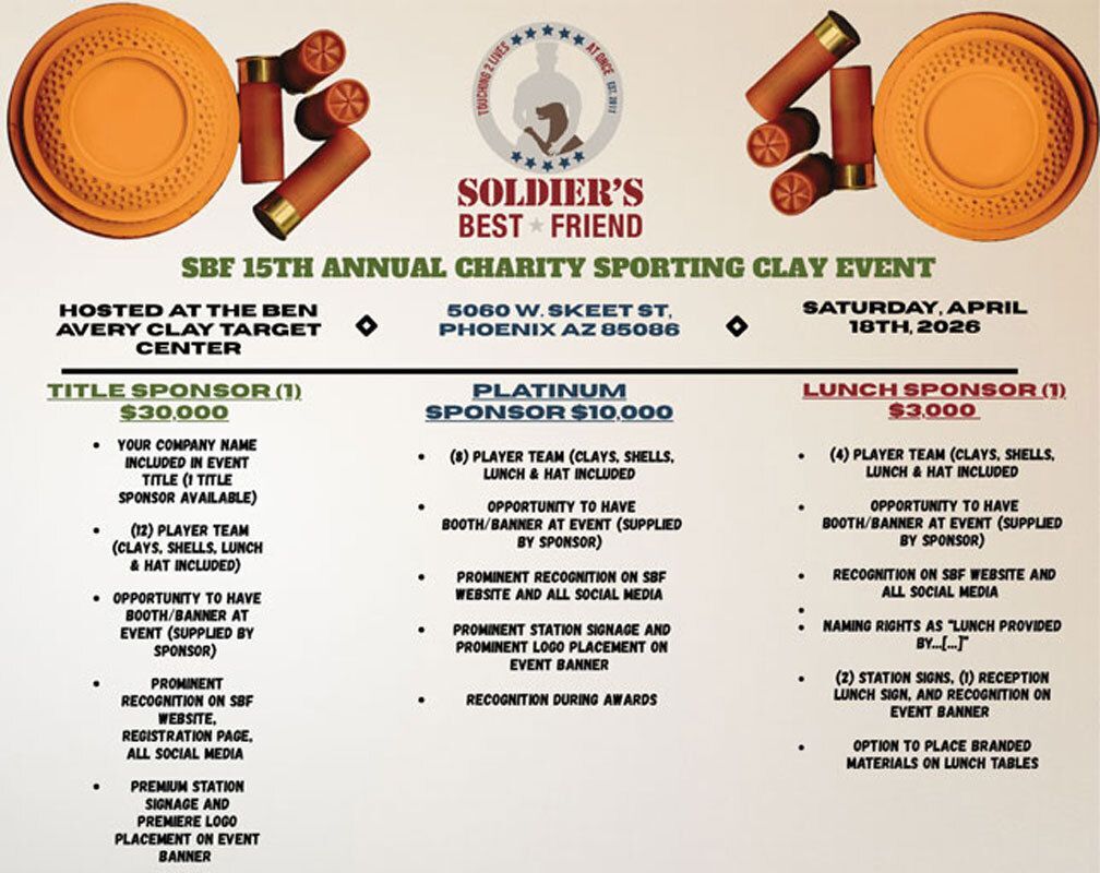 Soldier’s Best Friend invites you to join us for our Annual Sporting Clay Event at Ben Avery Clay Target Center in Phoenix. Come out for a fun-filled morning as we support our military veterans together. All proceeds from this event will go directly to providing life-changing services at no cost to eligible veterans. We can’t wait to see you there!